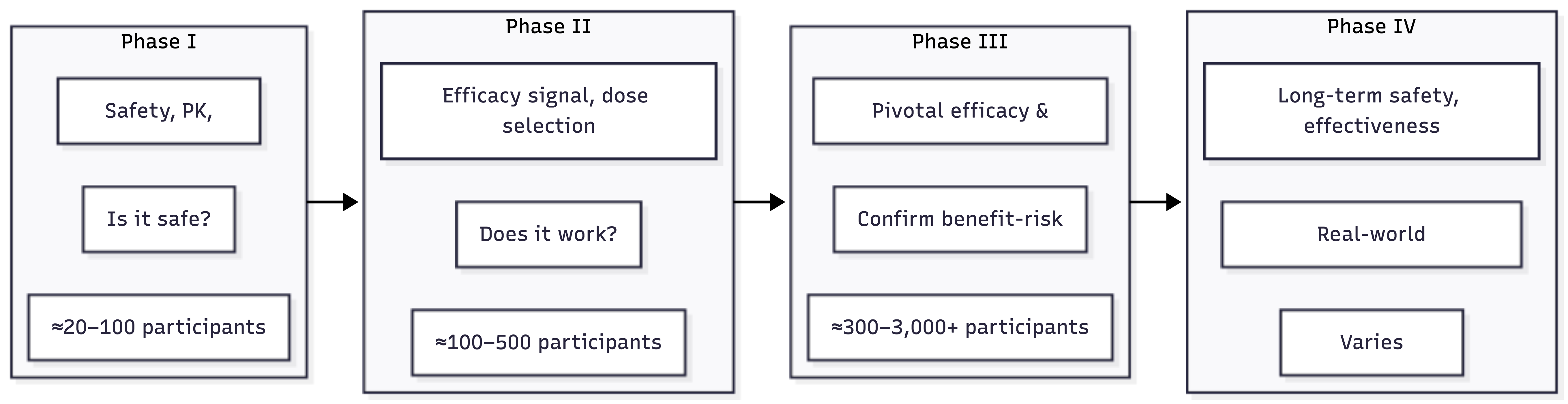 Clinical trials proceed through distinct phases, each with a primary purpose (summarized in Figure 2.3 and Table 2.1). The boundaries between phases are not always sharp—Phase I/II combination studies are common, and some programs run Phase II and Phase III concurrently—but the conceptual framework remains useful.