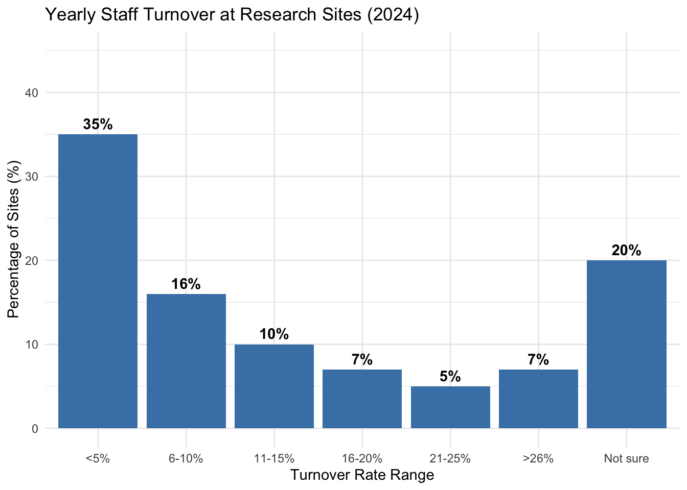 This attrition extends beyond investigators to the broader research staff. High turnover among clinical research coordinators (CRCs) and nurses disrupts continuity and increases the risk of documentation errors. While turnover rates have stabilized somewhat in 2024, a significant portion of the industry still faces high churn, complicating the long-term viability of sites (see Figure 17.4).