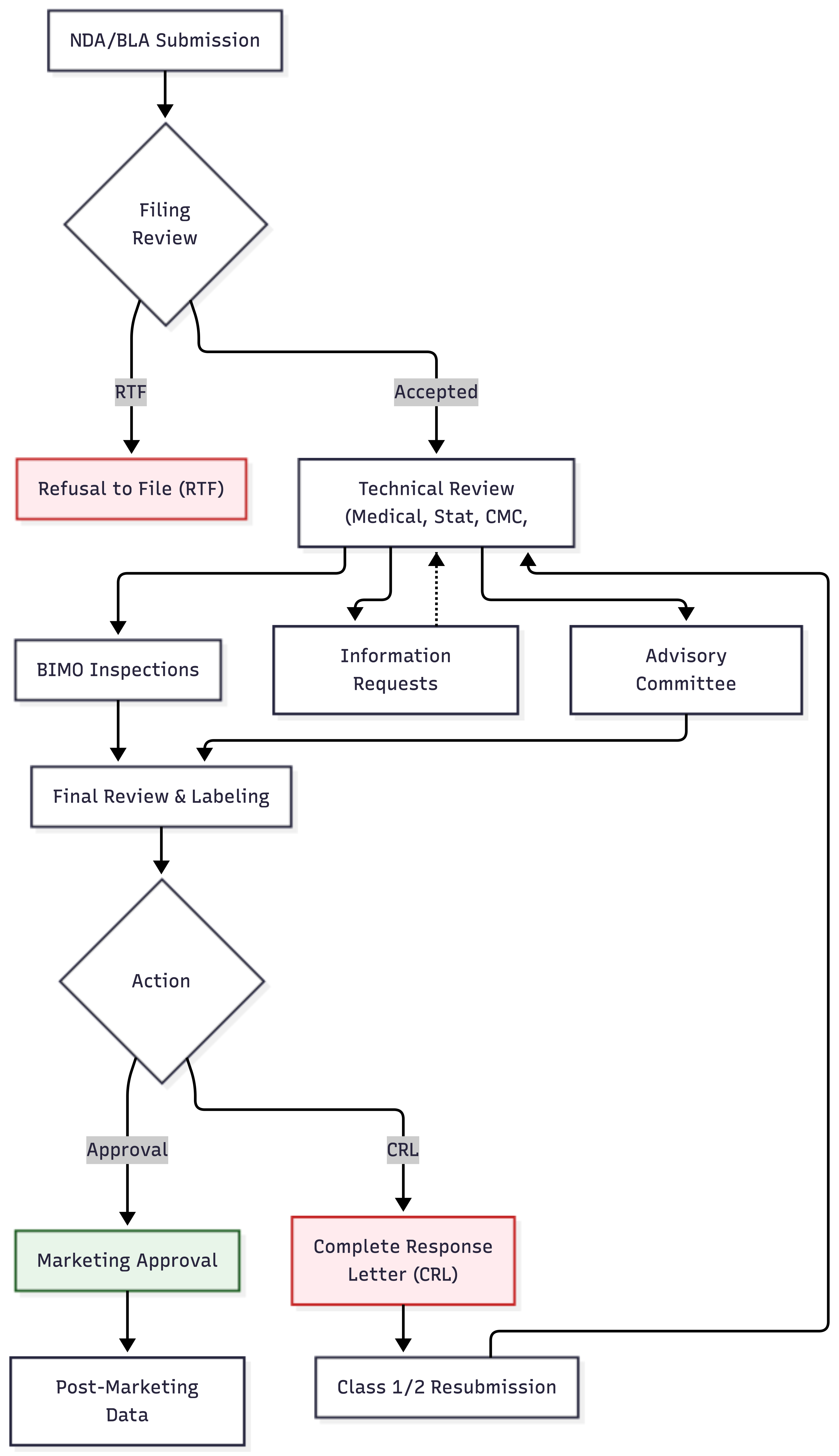 If accepted, the application enters a review queue. Review timelines are governed by user fee goals—performance targets established in legislation. Standard review typically takes 10-12 months from acceptance; priority review (for drugs addressing serious conditions with unmet needs) may be completed in 6 months.