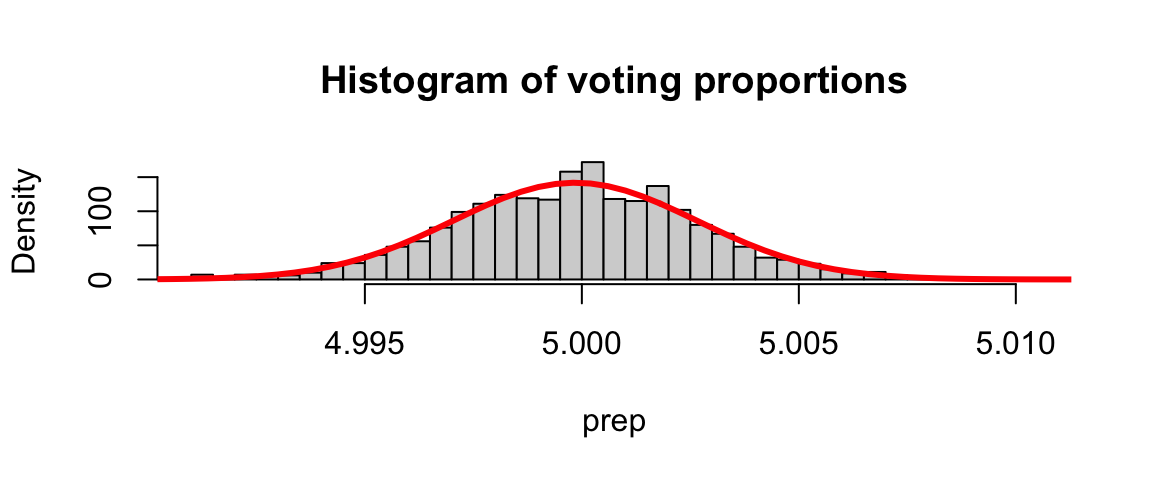 hist(prep, breaks = 30, freq = F, main="Histogram of voting proportions")
