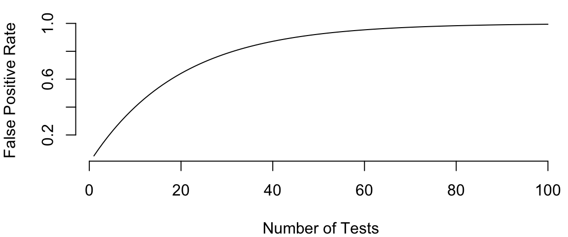 plot(1:100,1 - (1-0.05)^{1:100}, type='l', ylab="False Positive Rate", xlab="Number of Tests")