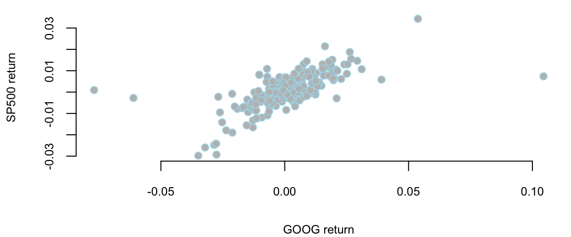 Example 9.3 (Google Stock Returns) Figure 9.2 shows the scattershot of Google and S&P 500 daily returns