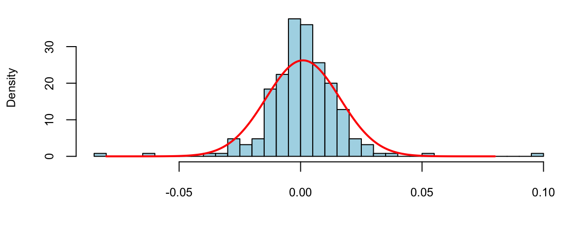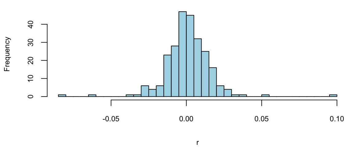 p =read.csv("../../data/GOOG2019.csv")$Adj.Close; n =length(p) r =log(p[2:n]/p[1:(n-1)]) hist(r, breaks=30, col="lightblue", main="")