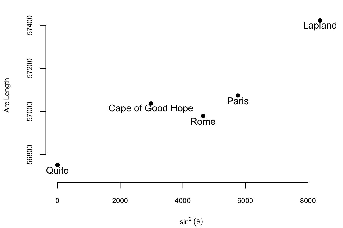 Example 9.1 (Boscovich and Shape of Earth) The 18th century witnessed heated debates surrounding the Earth’s precise shape. While the oblate spheroid model – flattened poles and bulging equator – held sway, inconsistencies in measurements across diverse regions fueled uncertainty about its exact dimensions. The French, based on extensive survey work by Cassini, maintained the prolate view while the English, based on gravitational theory of Newton (1687), maintained the oblate view.