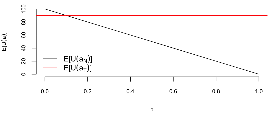 The goal of the decision maker is to minimize risk. Unfortunately, rarely is there a decision that minimizes risk uniformly for all parameter values. To see this, consider a simple example of \(y\sim N\left( \theta,1\right)\), a quadratic loss, and two decision rules, \(d_{1}\left( y\right) =0\) or \(d_{2}\left( y\right) =y\). Then, \(R\left( \theta,d_{1}\right) =\theta^{2}\) and \(R\left( \theta,d_{2}\right) =1\). If \(\left\vert \theta\right\vert <1\), then \(R\left( \theta,d_{1}\right) <R\left( \theta,d_{2}\right)\), with the ordering reversed for \(\left\vert \theta\right\vert >1\). Thus, neither rule uniformly dominates the other.