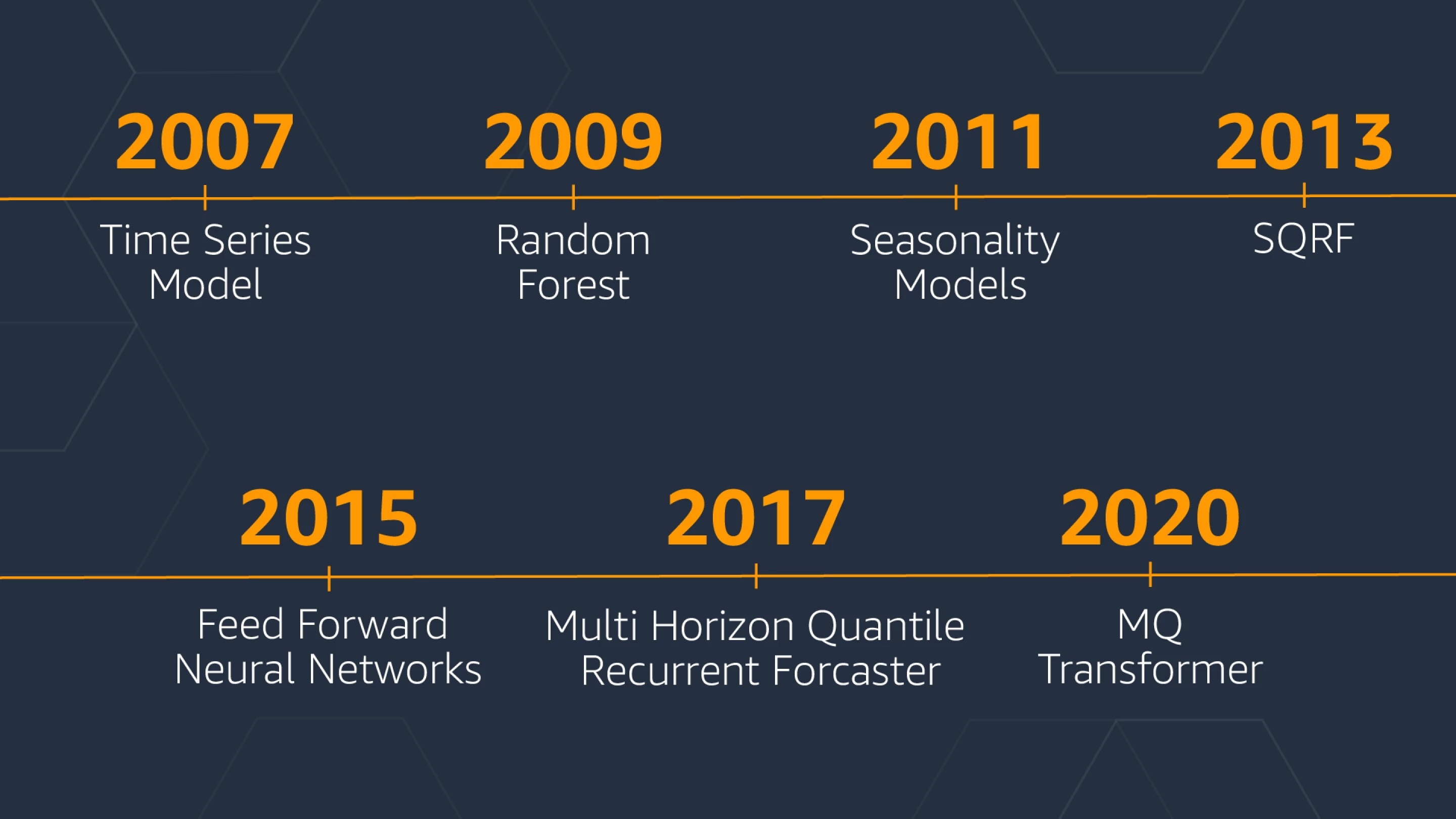 A recent post by the Amazon Science group Amazon (2021) describes the evolution of the time series algorithms used for forecasting from 2007 to 2021. Figure below shows the entire evolution of the algorithms.