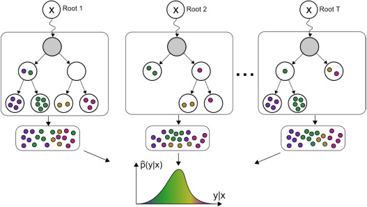 Informally, what it means that for a new unknown sample, we first find the leaf that it falls into at each tree. Then for each \((X, y)\) in the training data, a weight is given to \(y\) at each tree in the following manner.