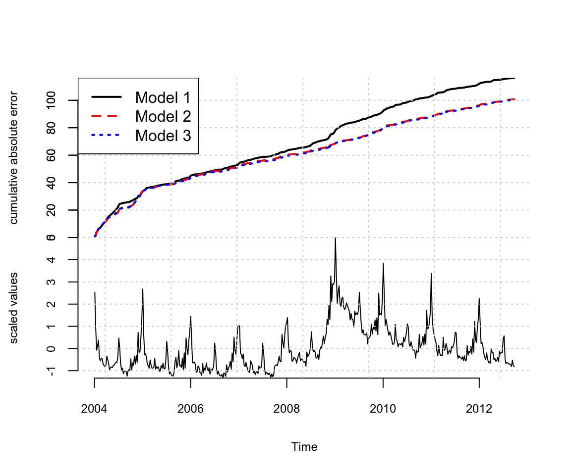 The bottom panel shows the original series. The top panel shows the cumulative total of the mean absolute one step prediction errors for each model. The final time point in the top plot is proportional to the mean absolute prediction error for each model, but plotting the errors as a cumulative total lets you see particular spots where each model encountered trouble, rather than just giving a single number describing each model’s predictive accuracy. This figure shows that the Google data help explain the large spike near 2009, where model 1 accumulates errors at an accelerated rate, but models 2 and 3 continue accumulating errors at about the same rate they had been before. The fact that the lines for models 2 and 3 overlap in this figure means that the additional predictors allowed by the relaxed prior used to fit model 3 do not yield additional predictive accuracy.