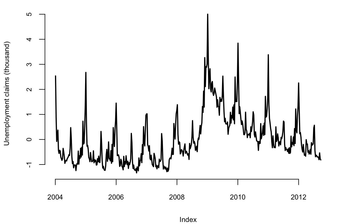 plot(initial.claims$iclaimsNSA, lwd=2, ylab="Unemployment claims (thousand)")