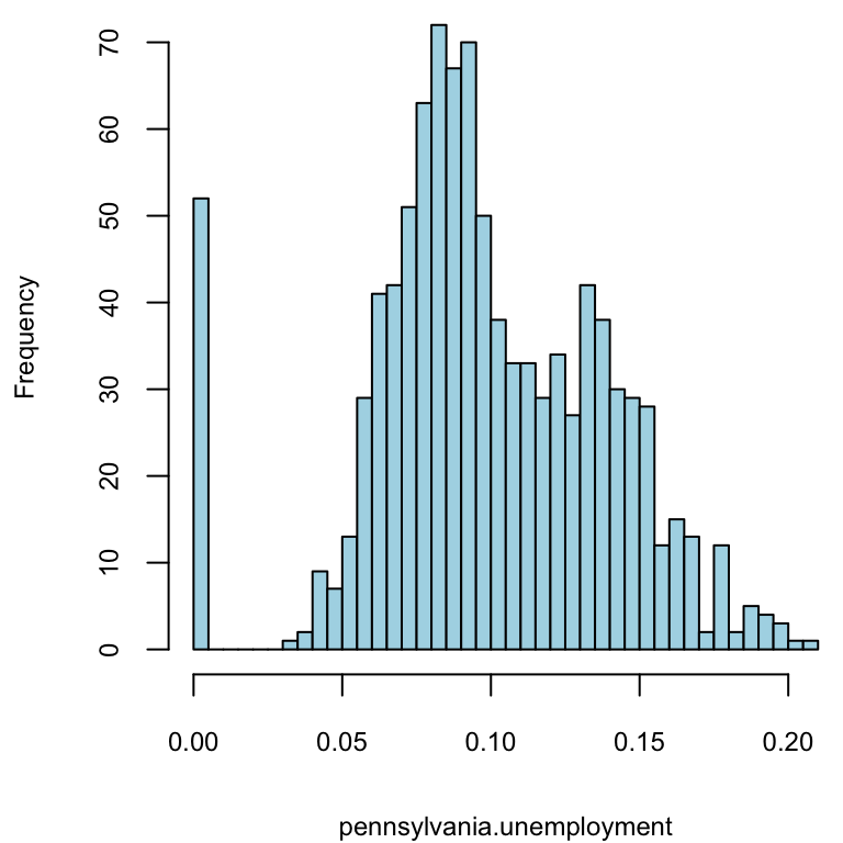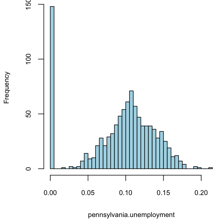 hist(model3$coefficients[,3], breaks = 40, main = "", xlab="pennsylvania.unemployment", col="lightblue")