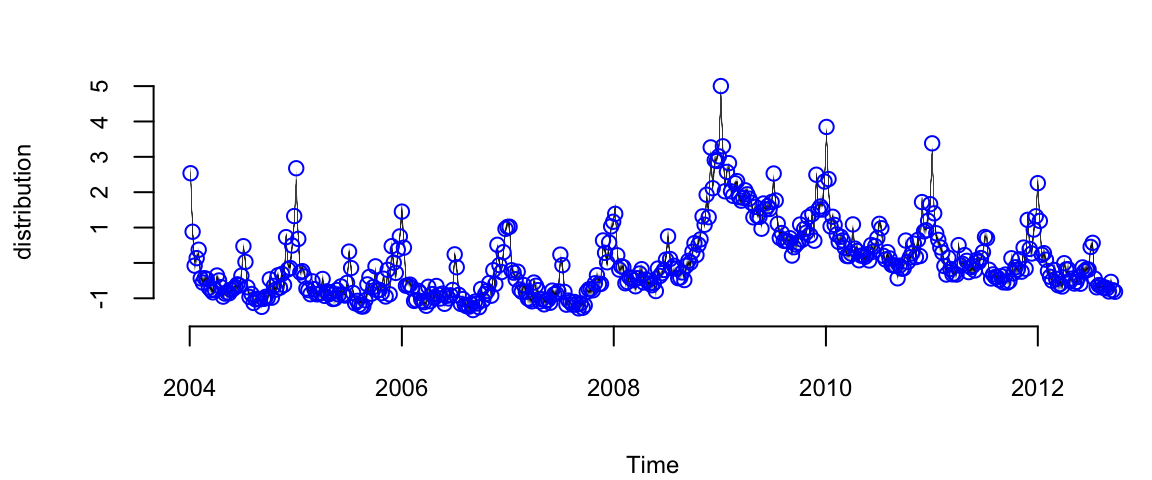 In addition to the trend models discussed so far, the function AddStudentLocalLinearTrend gives a version of the local linear trend model that assumes student-t errors instead of Gaussian errors. This is a useful state model for short term predictions when the mean of the time series exhibits occasional dramatic jumps. Student-t errors can be introduced into the observation equation by passing the family = "student" argument to the bsts function call. Allowing for heavy tailed errors in the observation equation makes the model robust against individual outliers, while heavy tails in the state model provides robustness against sudden persistent shifts in level or slope. This can lead to tighter prediction limits than Gaussian models when modeling data that have been polluted by outliers. The observation equation can also be set to a Poisson model for small count data if desired.
