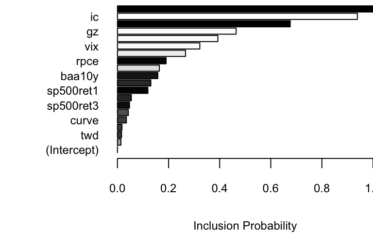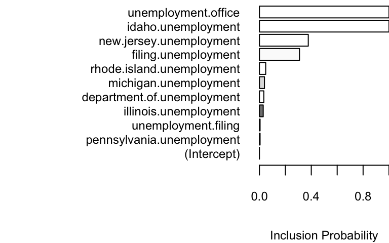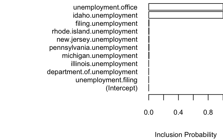 The search term “unemployment office” shows up with high probability in both models. Increasing the expected model size from 1 (the default) to 5 allows other variables into the model, though “Idaho unemployment” is the only one that shows up with high probability.