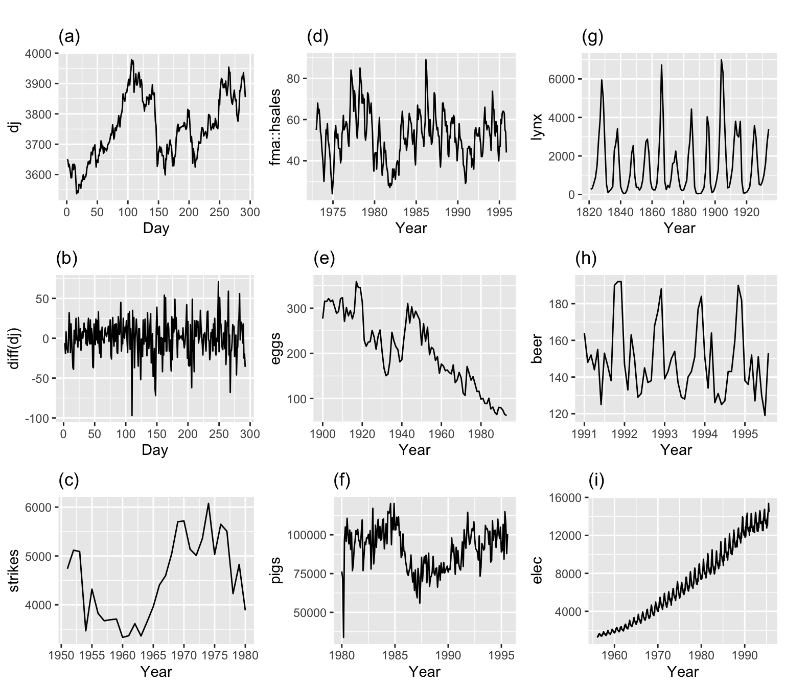 In other words, all the coefficients of a time series model do not change over time. We know how to deal with trends and seasonality quite well. Thus, those types of non-stationary are not an issue. Below some of the example of time series data. Although most of those are not stationary, we can model them using traditional techniques (Hyndman and Athanasopoulos (2021)).