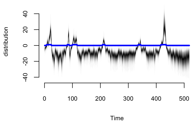 \] If you place your eye at time 0 and ask what happens at time \(t\) , you find that \(\mu_t \sim N(\mu_0,t\sigma^2\eta)\). The variance continues to grow with \(t\), all the way to \(t=\infty\). The local linear trend is even more volatile. When forecasting far into the future the flexibility provided by these models becomes a double edged sword, as local flexibility in the near term translates into extreme variance in the long term.