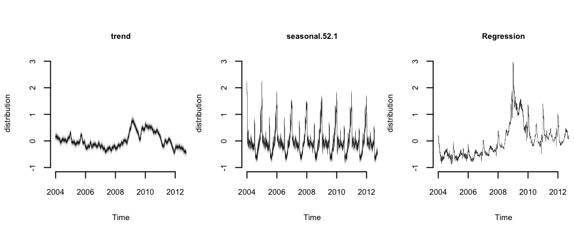 It produces the contribution of each state component to the initial claims data, assuming a regression component with default prior. Compare to the previous model. The regression component is explaining a substantial amount of variation in the initial claims series.