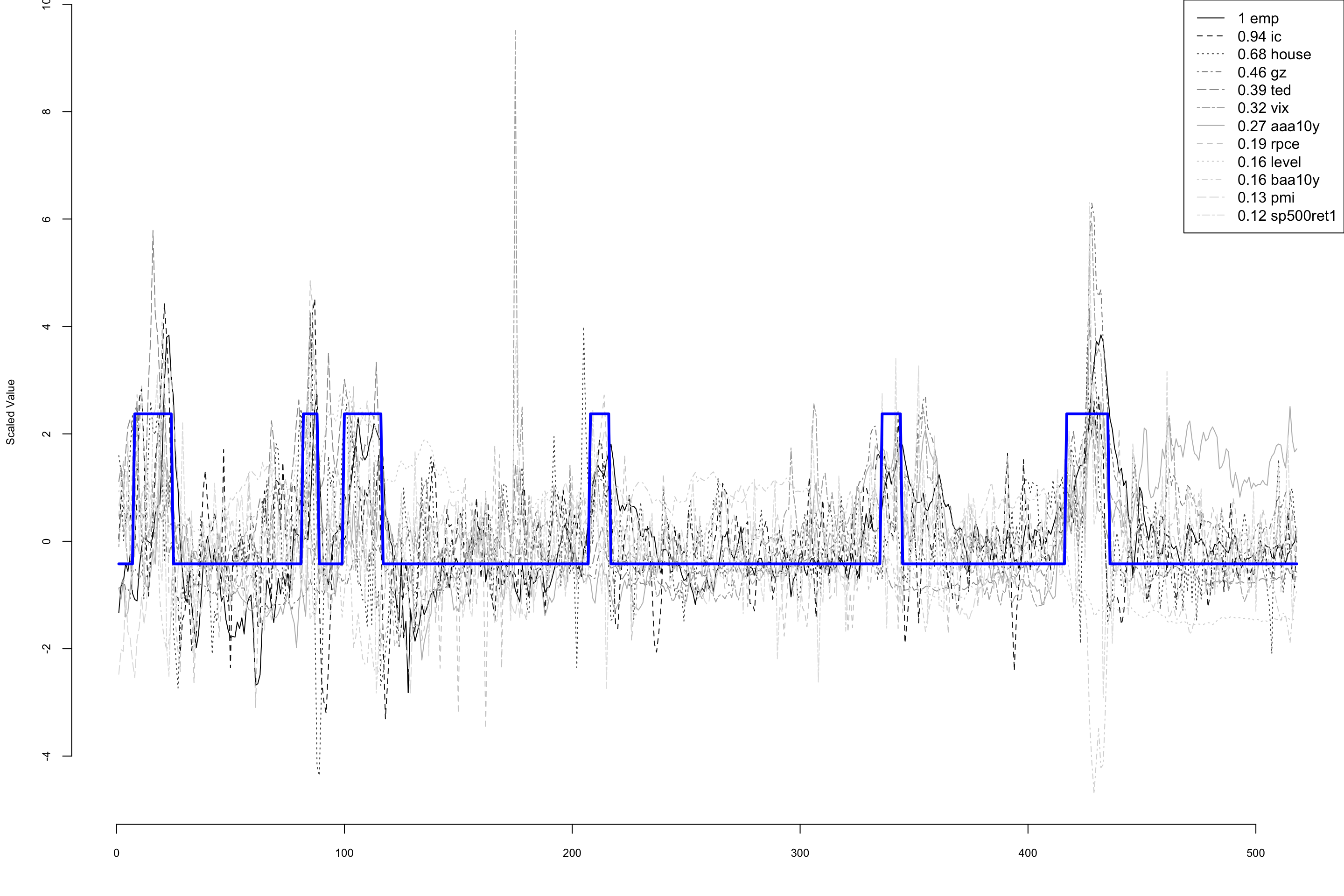 To see how non-Gaussian errors can be useful, consider the analysis done by Berge, Sinha, and Smolyansky (2016) who used Bayesian model averaging (BMA) to investigate which of several economic indicators would best predict the presence or absence of a recession. We will focus on their nowcasting example, which models the probability of a recession at the same time point as the predictor variables. Berge, Sinha, and Smolyansky (2016) also analyzed the data with the predictors at several lags.