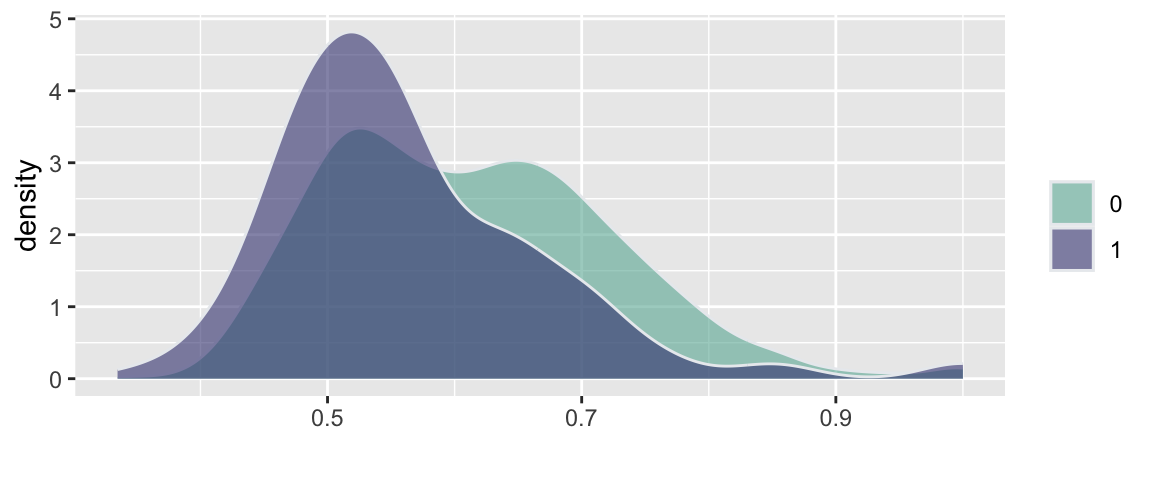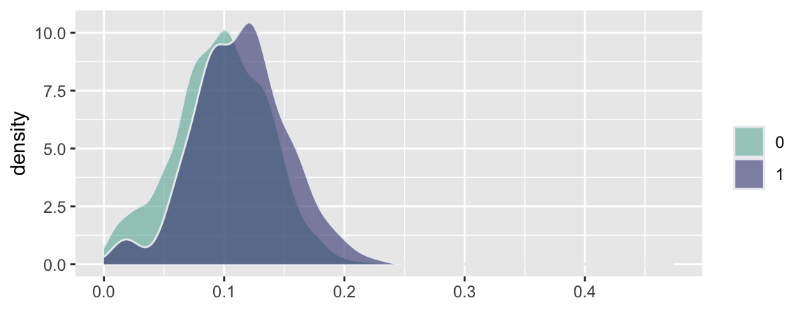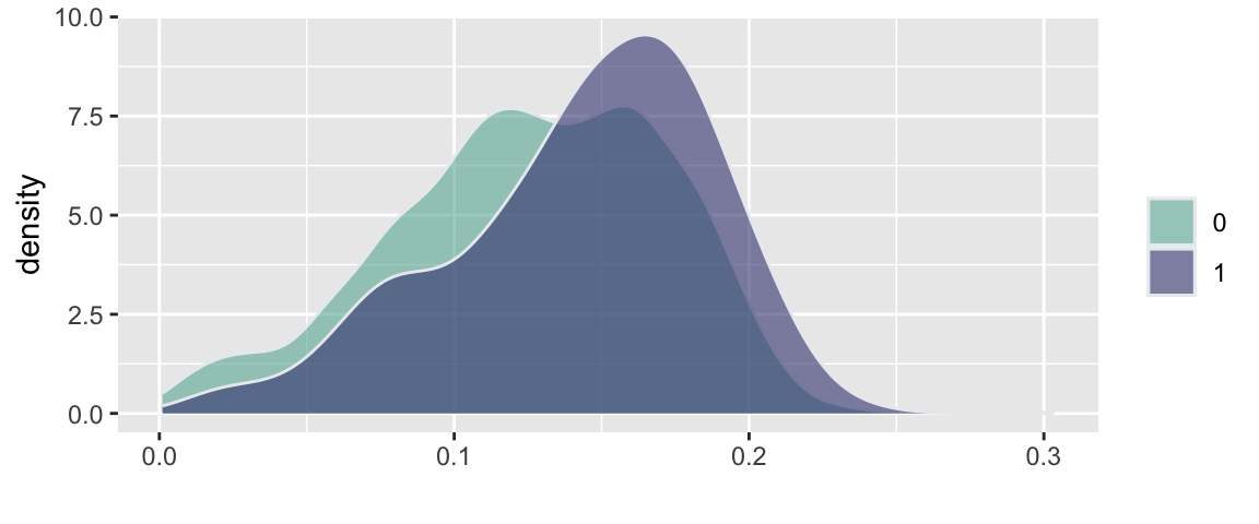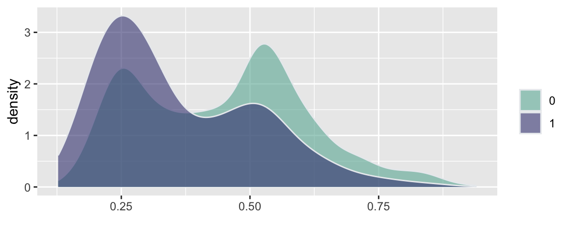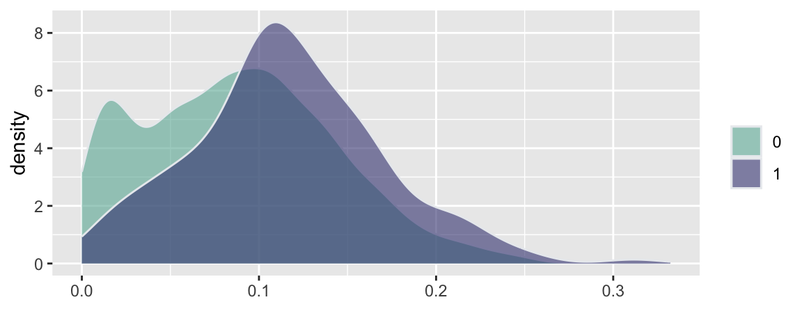 d =read.csv("../../data//PNAS_data_2011.csv")d %>%ggplot( aes(x=er_share, fill=as.factor(s))) +geom_density(alpha=0.6,color="#e9ecef") +labs(fill="") +xlab("")+scale_fill_manual(values=c("#69b3a2", "#404080")) d %>%ggplot( aes(x=turnout_share, fill=as.factor(s))) +geom_density(alpha=0.6,color="#e9ecef")+labs(fill="") +xlab("")+scale_fill_manual(values=c("#69b3a2", "#404080")) d %>%ggplot( aes(x=apple_share, fill=as.factor(s))) +geom_density(alpha=0.6,color="#e9ecef")+labs(fill="") +xlab("")+scale_fill_manual(values=c("#69b3a2", "#404080")) d %>%ggplot( aes(x=sr_share, fill=as.factor(s))) +geom_density(alpha=0.6,color="#e9ecef")+labs(fill="") +xlab("")+scale_fill_manual(values=c("#69b3a2", "#404080")) d %>%ggplot( aes(x=ldpr_share, fill=as.factor(s))) +geom_density(alpha=0.6,color="#e9ecef")+labs(fill="") +xlab("")+scale_fill_manual(values=c("#69b3a2", "#404080")) d %>%ggplot( aes(x=com_share, fill=as.factor(s))) +geom_density(alpha=0.6,color="#e9ecef")+labs(fill="") +xlab("ß")+scale_fill_manual(values=c("#69b3a2", "#404080"))