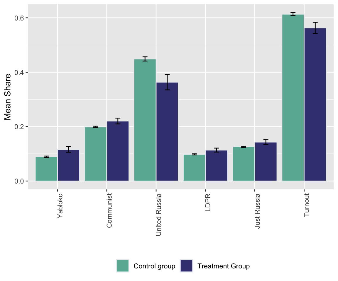 Example 8.1 (Russian Election Fraud: A Field Experiment) Enikolopov et al. (2013) show how a field experiment can be used to estimate electoral fraud in Russian parliamentary elections held on December 4, 2011. They randomly assigned independent observers to 156 of 3,164 polling stations in the city of Moscow. The observers were trained by the nongovernmental organization Citizen Observer. The authors compared the vote shares of the incumbent United Russia party at polling stations with and without observers. They found that the presence of observers decreased the reported vote share of United Russia by almost 11 percentage points. This suggests that the extent of the fraud was sufficient to have changed the outcome of the elections.